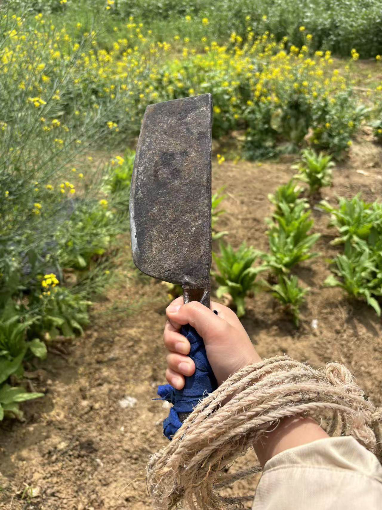 然后我们要去找更壮实一些的树,明明小时候家家户户屋前屋后都有很多树,这些年不知不觉都被砍去卖钱。但是这难不倒我,依依她们家菜园子旁边有一排水杉树,是最后的遗珠。真正难倒我的是爷爷给的绳子太短,以及小侄女觉得坐在绳子上荡秋千会让屁股疼,于是折返归家找爷爷要新的绳子和一块木板,最好木板两边还各穿一个洞。